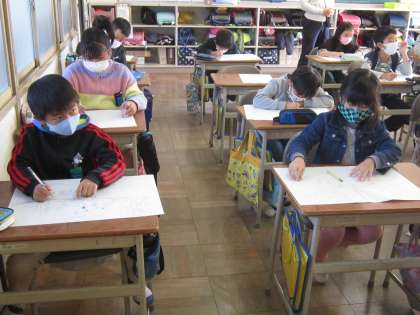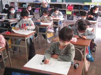 先生に読んでもらった本の場面を想像したり、感じたりしたことを絵に表しました。
