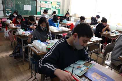 今日の図工では、手形アートを完成させました。自分の手形にかわいい雪だるまを描いていきました。また3学期も楽しい素晴らしい作品を作っていきましょう。