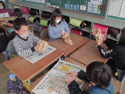 図工では、「くしゃくしゃ ぎゅ」の学習をしました。