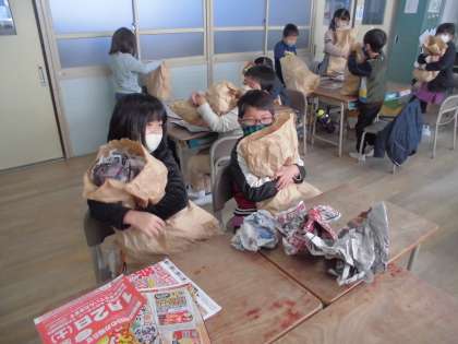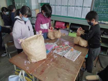 クラフト袋をくしゃくしゃにしたり、ふくらませてぎゅっとしぼったりして作っています。来週は飾りつけをします。