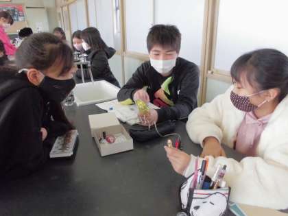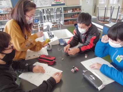理科では、自分たちで発電した電気で豆電球に明かりをつけられるか、ためた電気で明かりをつけることができるかについて調べました。なかなかうまくつかない班があり、苦労していました。