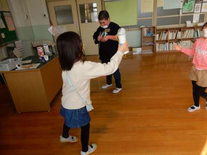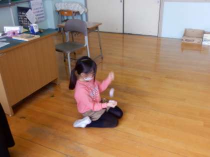 コマ回し、けん玉、お手玉は器用さが求められます。うまくできたときにはとてもよい笑顔が見られました。