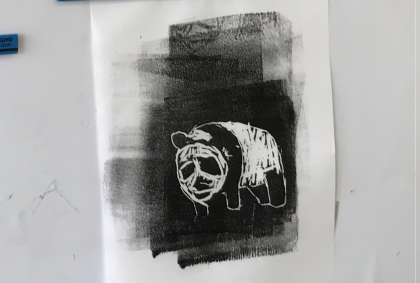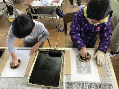 図工の時間に初めて彫刻刀を使って作品作りに取り組みました。今日は練習用の板にパンダの絵を彫刻刀で彫り、試し刷りをしてみました。白と黒のコントラストがどのように刷り上がるのか、みんなよく考えながら彫ることができました。