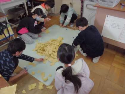 以前作った花と合わせると、大きな桜の木になります。みんな一生懸命取り組んでいます。