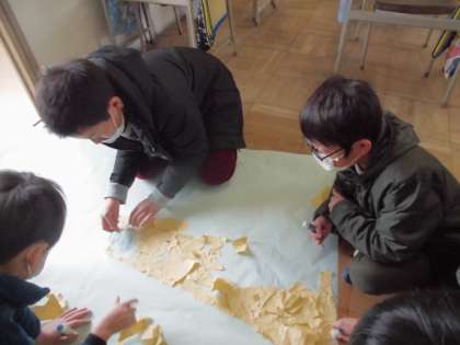 6年生を送る会や、卒業式に向けて廊下や昇降口の掲示物をつくりました。紙をしわしわにしながら、立体感がでるように貼ります。