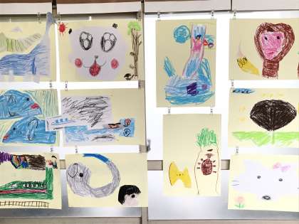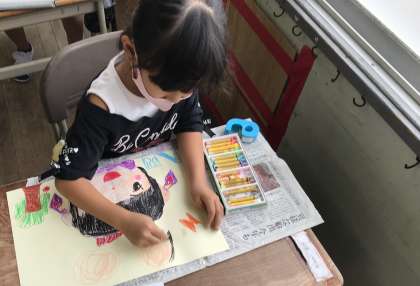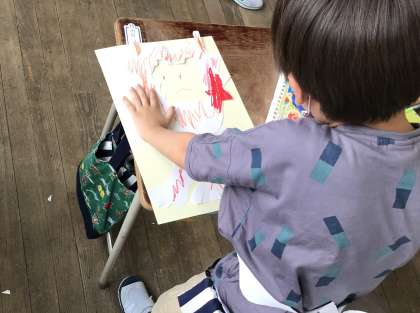 画用紙をはさみで切り、できた紙の形を見て、何に見えるのか想像しました。一枚の画用紙から、切って色を塗ることで、さまざまなものに変身する面白さを感じていました。
