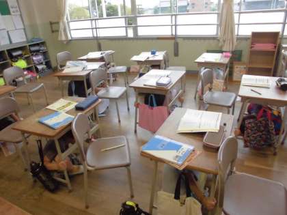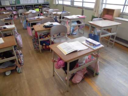 避難訓練がありました。緊急地震速報の放送を聞いて、子どもたちは瞬時に机の下に隠れることができました。