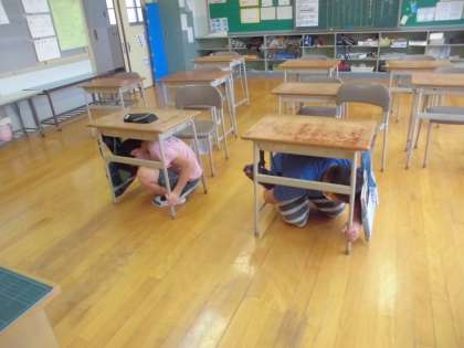 今日は、避難訓練をしました。 机の下に隠れるときに、脚を斜めにもつことを頑張りました。
