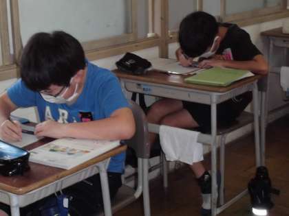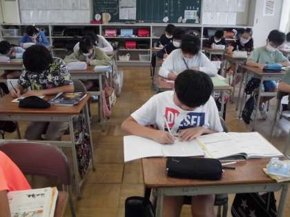 算数の時間の様子です。算数の学習では、教科書の内容以外に簡単な計算問題を速く・正確に解く練習をしています。「1分」という時間制限がある中で、数問の問題を解いていきます。みんな集中して解いています。昨日よりも正当数が増え、喜んでいる子もいました。
