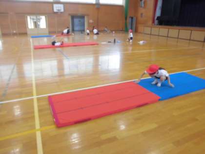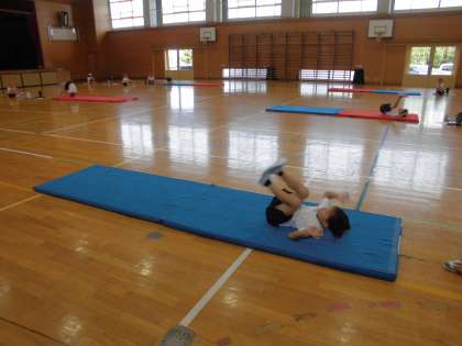 子どもたちは、まえころがりと後ろころがりを上手に転がるために