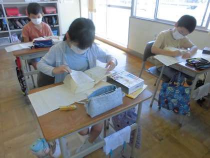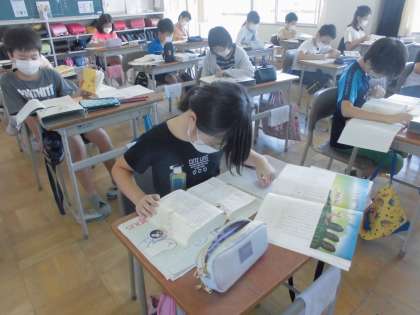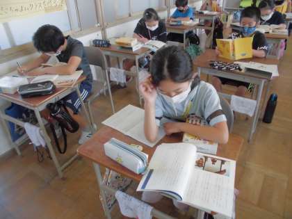 今日の国語の授業では、ごんぎつねの本文に出てくる言葉の意味を辞書を使って調べました。難しい言葉が多い物語でもあるので、たくさんの言葉を調べていました。