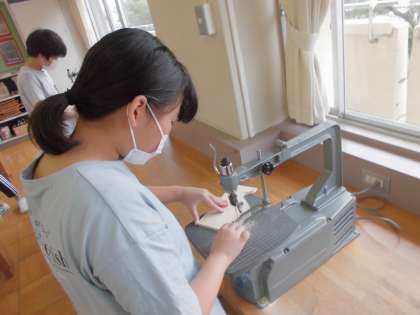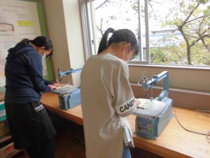 図工の時間は、テープカッターの制作を進めています。電動糸鋸を使って、自分の思いに合った形に切りました。5年生でも使っているので、慣れた手つきで取り組んでいました。