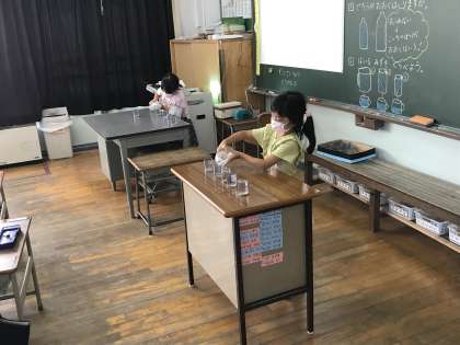 今日の算数では、容器に入った水のかさの比べ方を考えました。みんなで実際に水を移し変えながらいろんな方法を試すことができました。