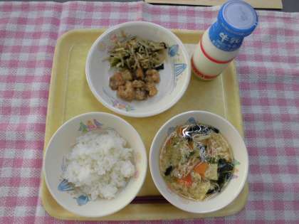 今日は、角切りにした鮭を給食室でカリッと揚げて、手作りのレモンマヨソースをからめました。