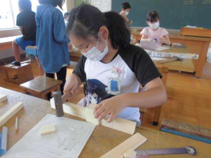 今日の図工では、のこぎりを使って木を切り、くぎを打って組み立てました。思い思いの作品に仕上げるため、みんな一生懸命頑張っていました。