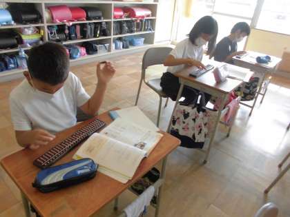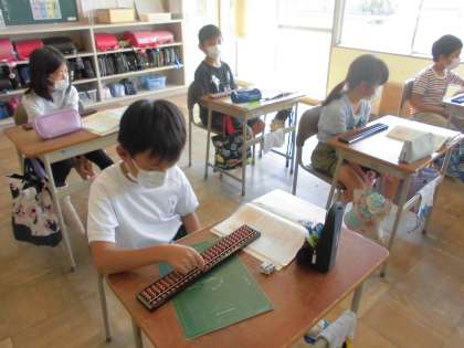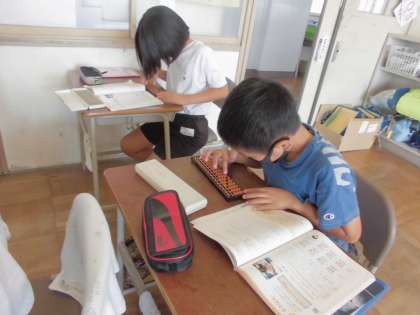 今日の算数では、そろばんをやりました。普段の計算とはやり方が違うので、難しく感じている子が多くいましたが、なんとか理解しようと、一生懸命やっていました。