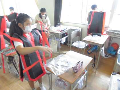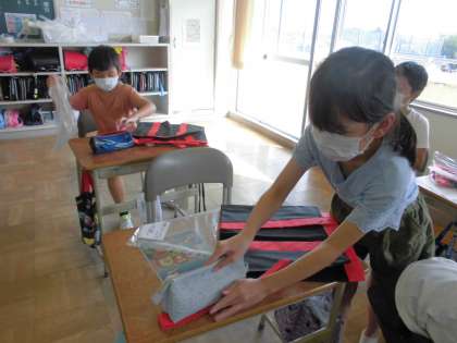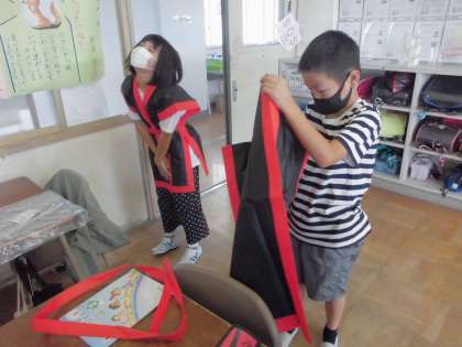 今日は運動場の状態が良くなく、グラウンドでの練習ができませんでした。本番に向けて、衣装の試着をしました。ひもの結び方や着方を忘れてしまっている子もいたので、去年を思い出しながら着ていました。運動会に向けて準備が進んでいます。