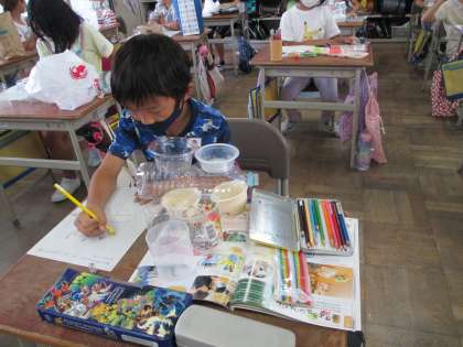 今日の図工は、立体作品「空き容器のへんしん」の設計図をかきました。持ってきた空き容器を並べたり、組み合わせてみたりしながらイメージを膨らませました。
