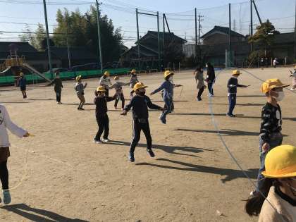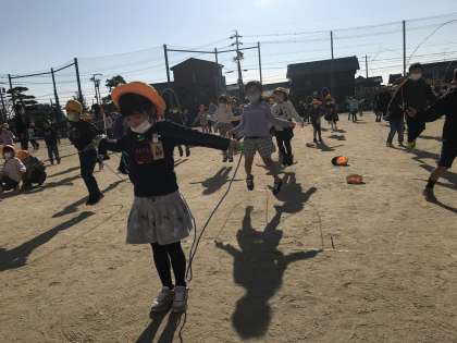 休み時間になると、なわとびの練習をみんながんばっています。放送のリズムに合わせて最後まで跳び続けることができるようになってきました。