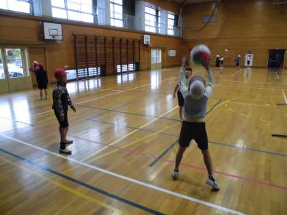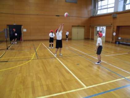 2組の体育の様子です。チームでボールをつなぐことを目的として取り組めていました。