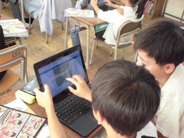 今日のめあては「道のりときょりの違いを理解して、単位変換を使って道のりの加減計算の仕方を考える」です。学習活動では、デザインソフト を用いて地図の図に書き込みながら、経路の長さである道のりを具体的に考えました。子供たちは、自分で図に表すことで、道のりの計算に必要な知識と技能を深めることができました。