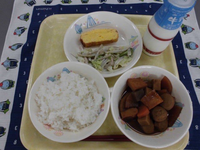 牛乳・ご飯・厚焼たまご・ごぼうとハムのマヨあえ・みそおでん