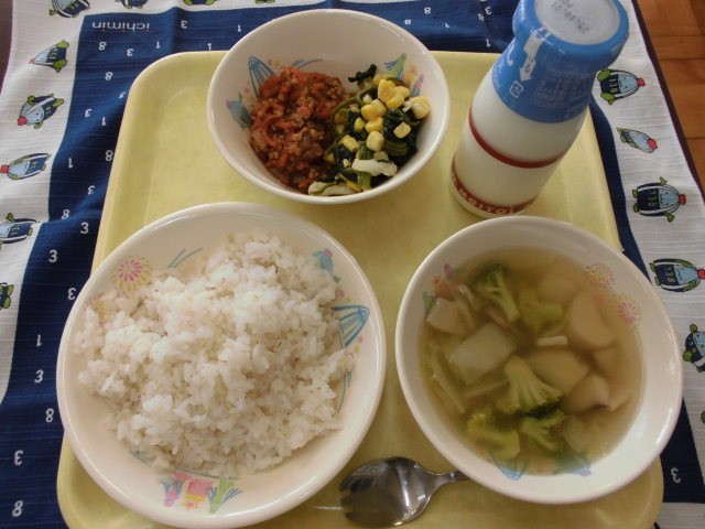 牛乳・麦ご飯・にんじんのカラフル丼の具・カラフルサラダ・ABCマカロニスープ
