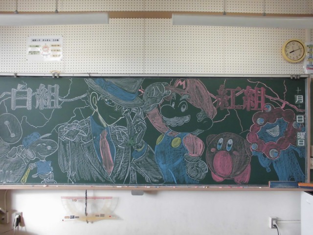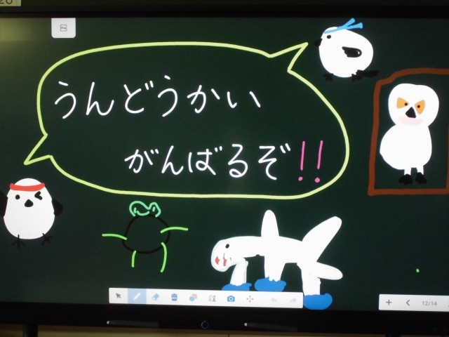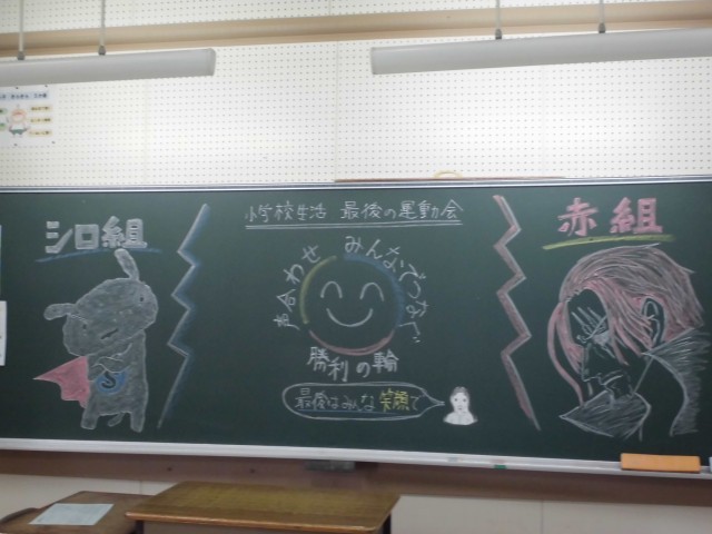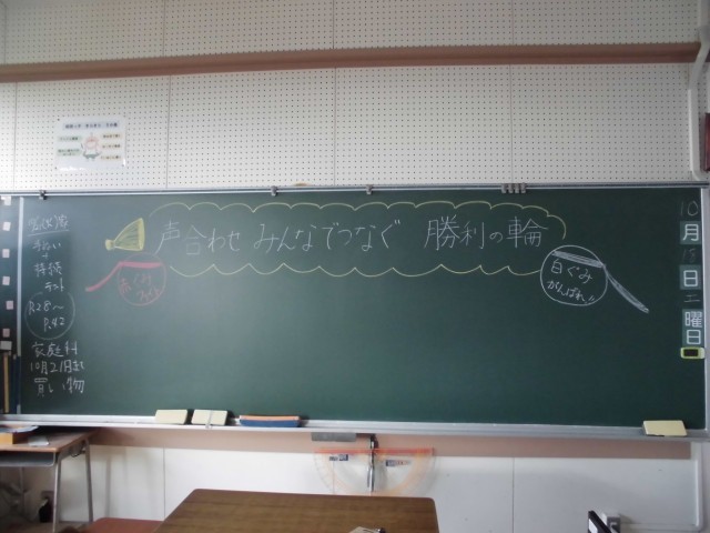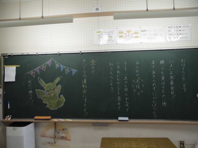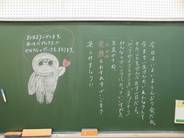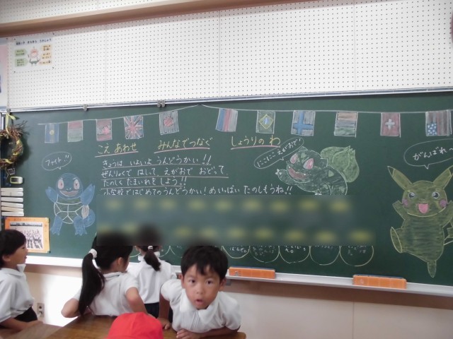 また、教室の黒板にも子供たちを迎えるためのメッセージが書かれていて子供たちの気持ちも高まっています。