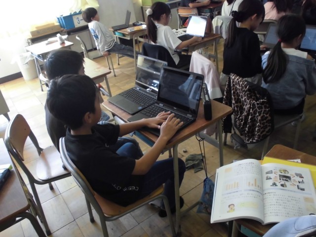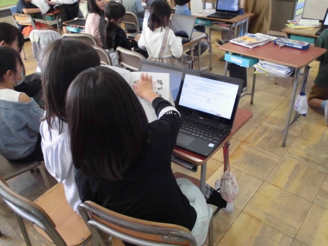 教科書に書かれていることを見ながら友達と一緒に情報を収集し、整理・分析、まとめをしました。