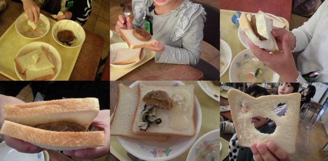 1年生は、先生に教わりながらも、自分なりの食べ方で楽しみました。シチューにつけたり、ハンバーグを乗せたり、はさんだりと、食べ方は十人十色。中にはパンをちぎって顔を作るユニークな子もいて、個性が光ります。