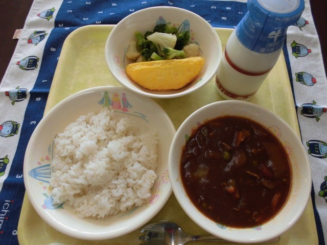 牛乳・麦ご飯・オムレツ・花野菜サラダ・ハヤシライス