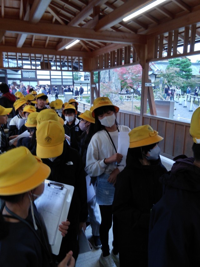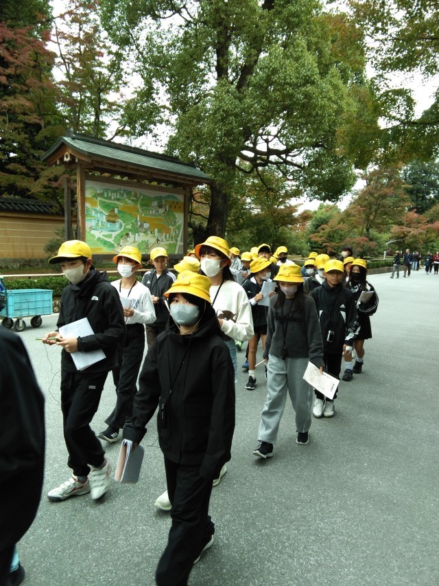 修学旅行最後の見学地は金閣に到着しました。金色に輝く金閣を見るのをみんな楽しみにしていました。