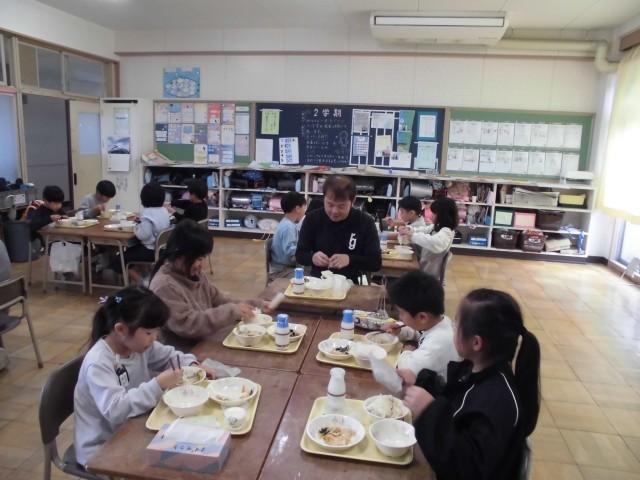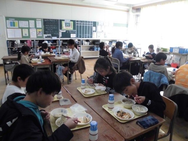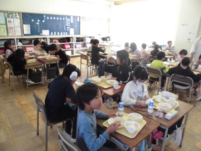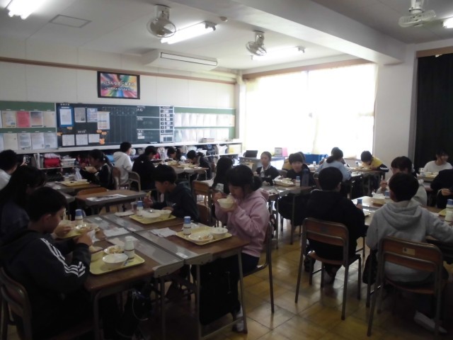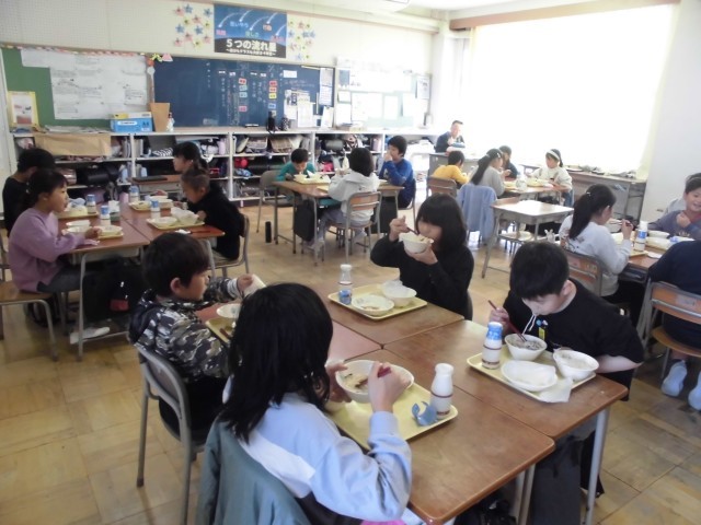 今日の給食は、子どもたちに大人気のちゃんぽん麺でした!ちゃんぽんスープにソフト麺を入れてちゃんぽん麺にして食べるスタイルで、皆とても楽しみにしていたようです。