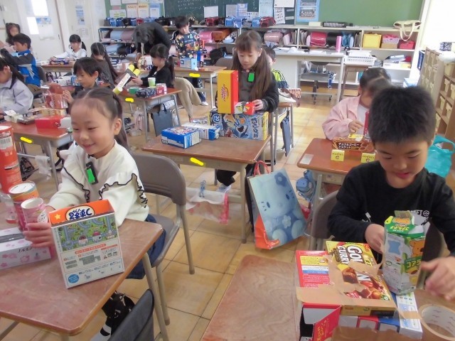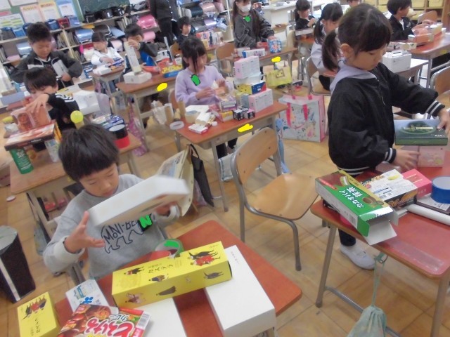 図画工作科の学習「はこでつくったよ」では、子どもたちが様々な大きさの空き箱を使って、思い思いの作品づくりに取り組んでいます。