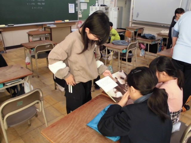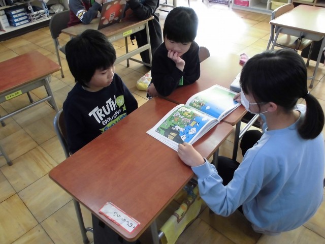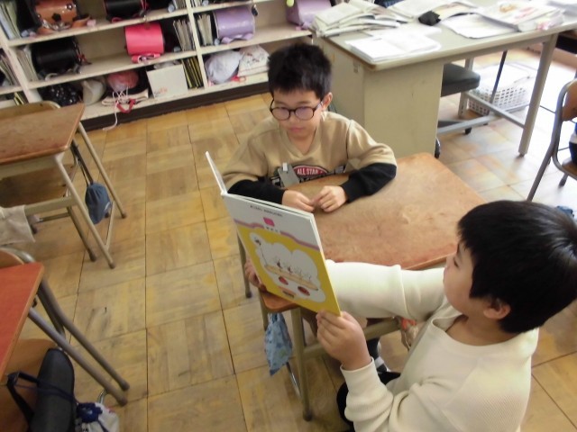 上級生が下級生に優しく絵本を読み聞かせていました。教室のあちこちで、本を間に挟んで顔を寄せ合う姿は、とても微笑ましい光景でした。