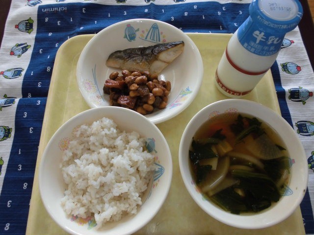牛乳・麦ご飯・ほっけの塩焼き・鉄火みそ・けんちん汁