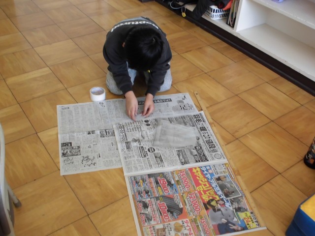 今日の4年生の算数は、広さの単位「1㎡」の学習です。新聞紙をテープでつなぎ合わせ、実際に1辺が1mの正方形を作ってみました。