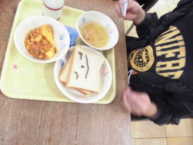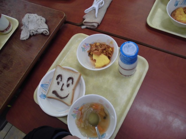 今日は、子どもたちに人気の食パンとチョコクリームが出ました!チョコクリームを食パンに塗ったり、楽しそうに絵を描いたりしながら、おいしく食べている笑顔があふれていました。