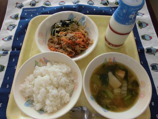 牛乳・ご飯・ビビンバの具(肉)・ビビンバの具(野菜)・ワンタンスープ