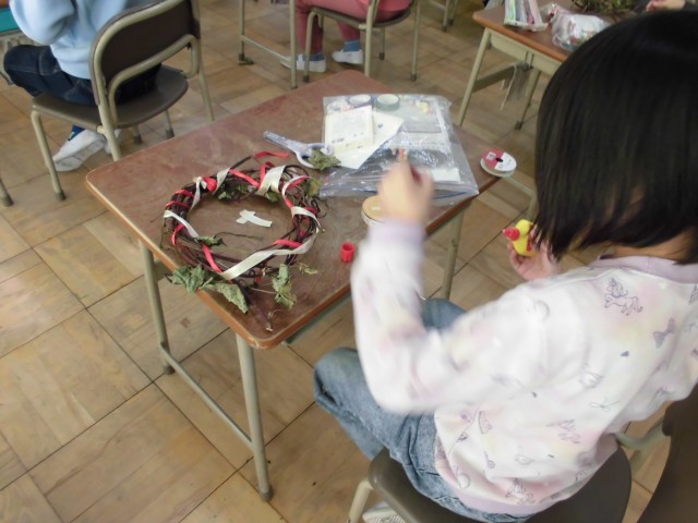 各自、飾り付けの材料を持ち寄り、世界に一つだけのオリジナルリースを目指し取り組みました。