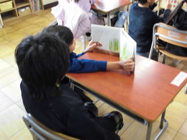 今日の朝の時間は、3年生が1年生の教室を訪れ、「読み聞かせ」を行いました。
