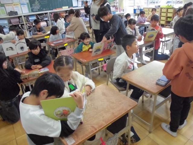 今日、3年生が1年生の教室を訪れ、絵本の読み聞かせをしてくれました。今回は全体に向けてではなく、1年生と3年生がペアになり、「一人一冊」じっくりと読むスタイルで行われました。3年生は、ペアの1年生が楽しめるようにと、感情を込めたり、ページをめくるペースを合わせたりして、一生懸命に読んでくれました。その姿はすっかり頼もしい上級生です。1年生も、お兄さん・お姉さんが読んでくれるお話をとても楽しそうに聞き入っていました。