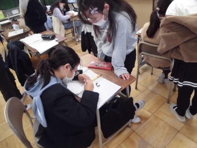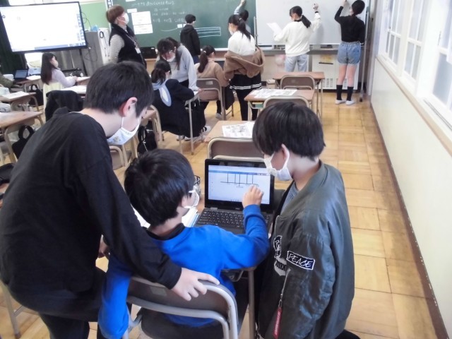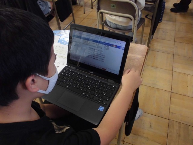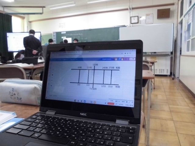 教科書の問題を全員で共有するとすぐに子供たちは情報収集に入りました。読み取った情報を端末にまとめる、図を描く、ノートに計算するなど、自分に合った方法でコピー機の印刷の速さを整理分析していきました。自分なりに答えにたどり着いたら次は友達へ解き方を説明していきます。自分の考えをアウトプットしていくことで思考を深めていきます。