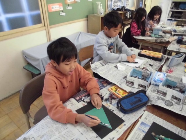 後半には、工場から持ってきてもらった布の端切れを使って、クリスマスツリーの製作をしました。みんな、端切れの柄を上手に組み合わせながら、すてきなツリーを作ることができました。