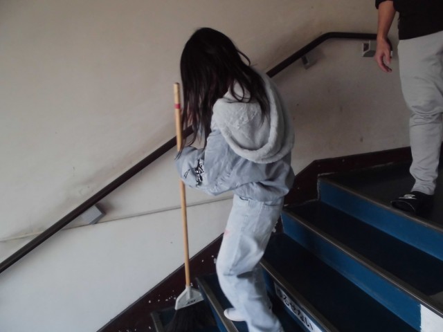 家庭科の時間に「ものを生かして住みやすく」の学習を行いました。今回は、各自が校内の気になる場所を選び、掃除計画を立てて実践です。