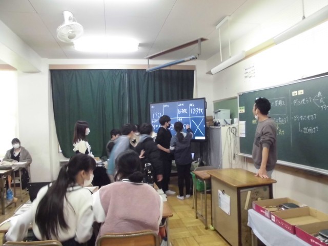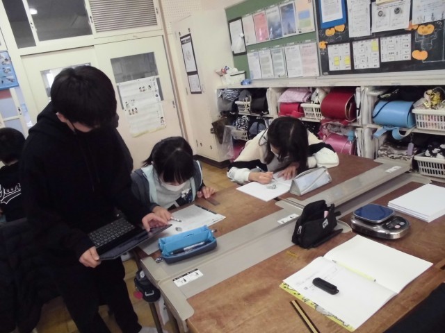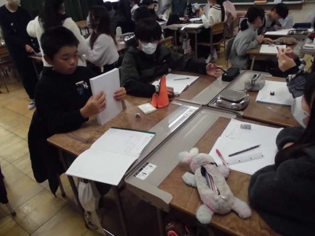 各グループでは活発な話し合いが行われ、「厚さを測って1枚分で割る」「全体の重さを量る」など、習ったばかりの比例の考えを応用する姿が見られました。実際に定規やはかりを使い、両方の方法で結果を確かめる探究心に感心しました。算数が生活に役立つ楽しさを実感した1時間でした。