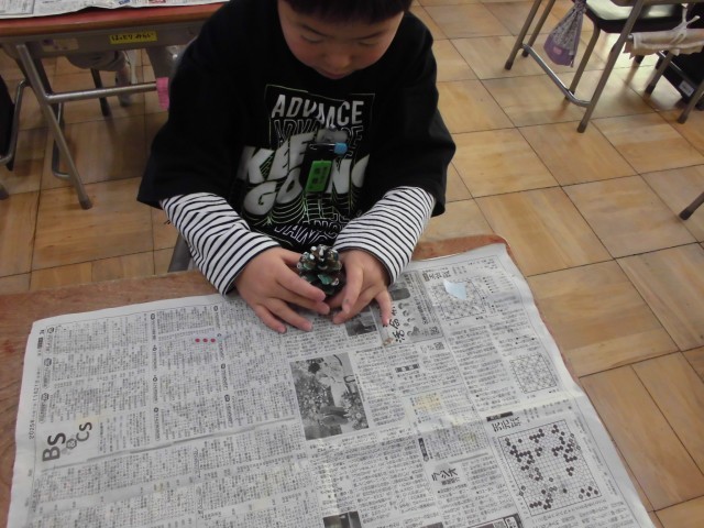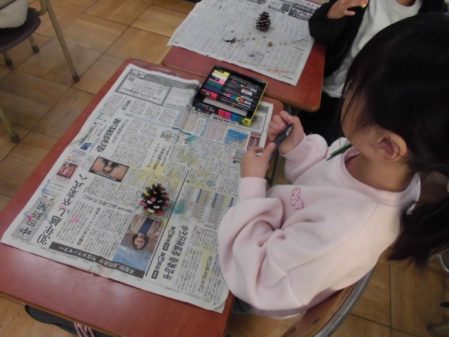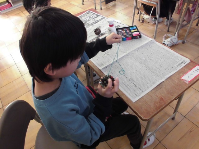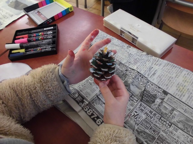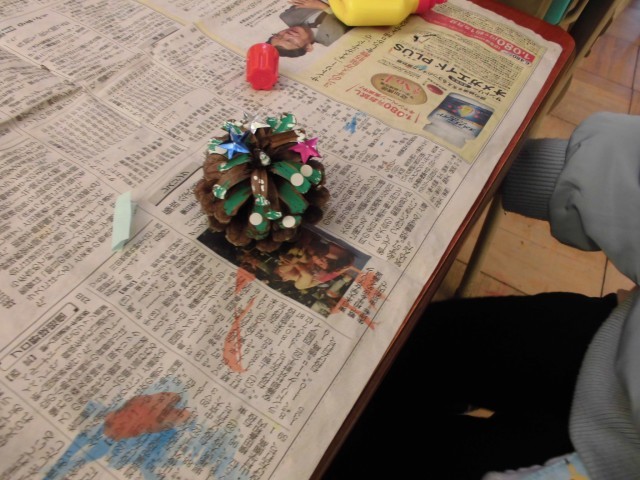 松ぼっくりを使ったクリスマスツリーづくりをしました。