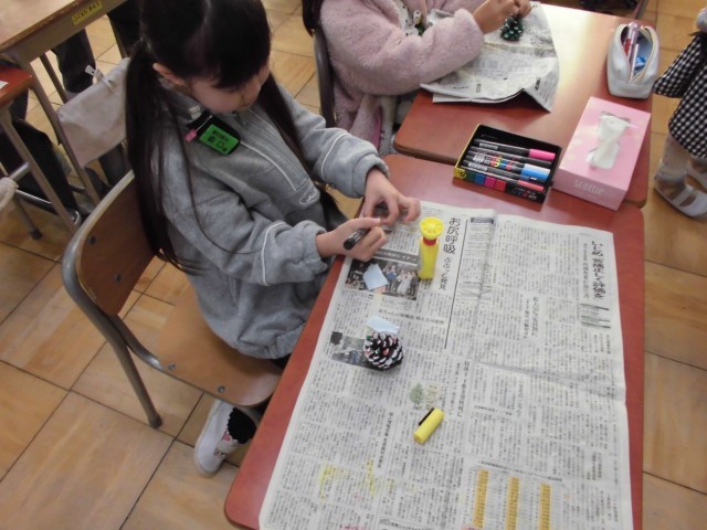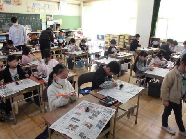 ポスカで白や緑に色を塗り「雪のツリー」を表現したり、折り紙の星を丁寧に飾ったりと、自分だけの素敵な作品が完成しました。もうすぐクリスマス。一生懸命作ったみんなのもとに、サンタさんは来てくれるかな?冬休みまであと少し、元気に登校しましょう。