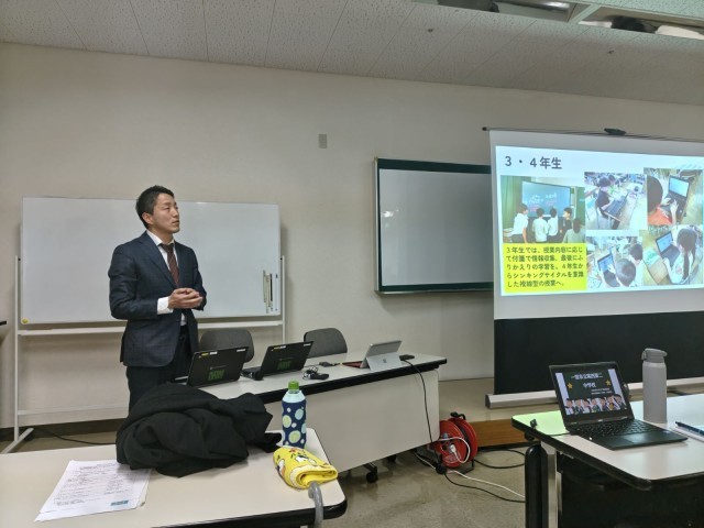 本校がこれまでに取り組んできた「リーディングDXスクール事業」の実践について、他市町の先生方に向けて報告を行いました。