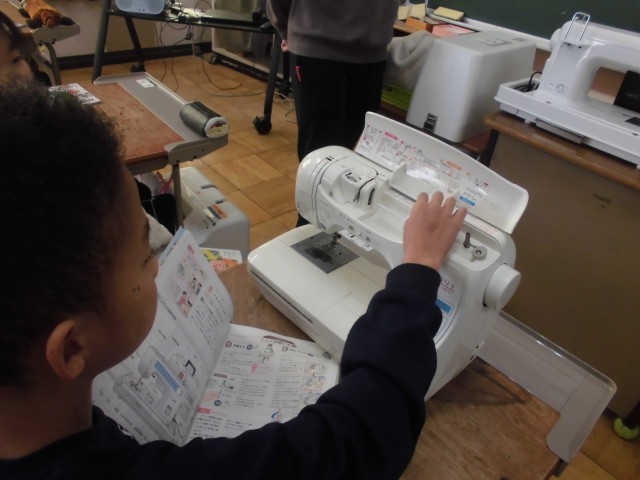 5年生の家庭科では、いよいよ「ミシン」の学習がスタートしました。ほとんどの子が、ミシンを見るのも触るのも初めてでした。教科書で部品の名前を覚えたあと、本物のミシンを目の前にして「これがその部品だ。」と熱心に観察する姿が見られました。使い方の手順を学んだあと、最後にはミシンの針の取り付けにも挑戦しました。少し緊張した様子でしたが、どの子も真剣な表情で練習に取り組んでいました。